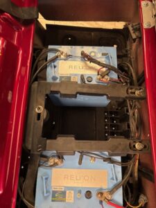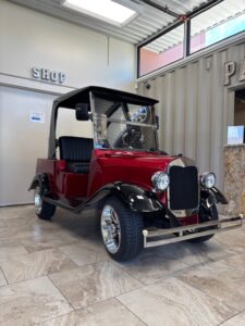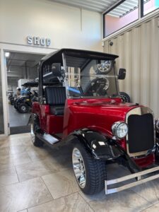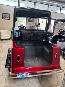 Includes Lithium batteries, Custom Winshield Fold Down, Side Mirrors, Custom Candy Apple Red Paint with Custom Paint Black Fenders, Custom Standard Head light, Tail light, Brake Light, Horn, Turn Signals, Glove Box, Radio, Tire size 205x30x14 Excel Endura, 14″ Chrome Mag Wheels, Chrome Finishings, AC Motor Brake, Fully Service, Speed 39mph, and Title.