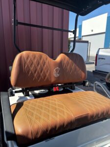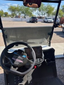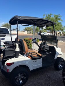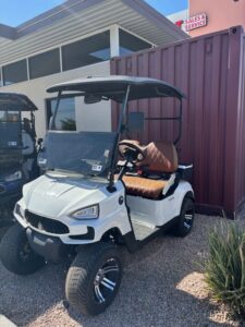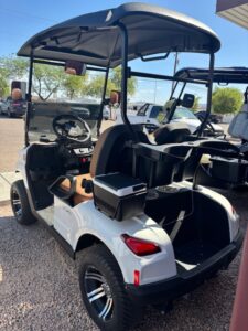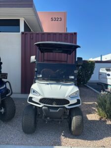 Includes New 108ah Lithium V3-Power Battery, New Tinted Fold Down Windshield, New Street Legal Light Kit with Turn Signals, Factory White Body, Factory Brown vinyl seats, Standard 54″ Black Top, New 215/50-10 Wanda Street Tires and 12″ Wheels, New Rear View Mirror, New Side Mirrors, 11″ touch screen display w/ Radio and Backup Camera, New Voltage Reducer, Speed 24 mph, Quality Control, Onboard Charger, and MCO.